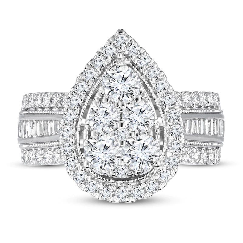 Boasting an impressive 2 carats in total diamond weight, this eye-catching diamond engagement ring is fahsioned in 10K white gold and features stunning round diamonds forming its pear-shaped center. Additional round diamonds halo the center and beam down the band with baguette diamonds in between.